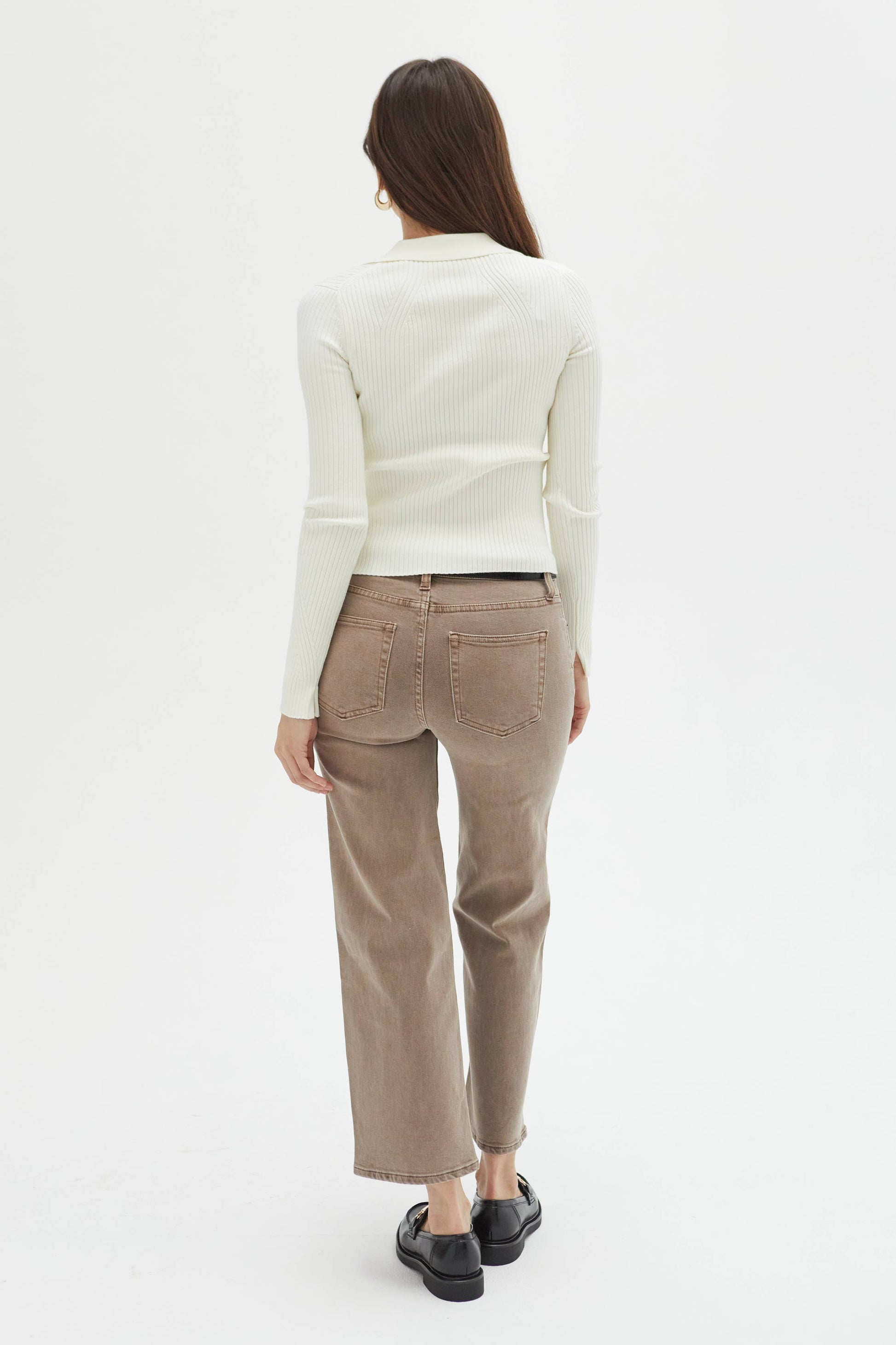 Jeans you'll keep plans for. THE FIT: Mid rise, fitted through the hip with a zipper fly––detailed with a finished hem and ankle slit. THE FEEL: Midweight, ultra-soft cotton with stretch, bounce back, and a premium on-body feel. • Rise 10" Leg Opening 18 3/4" Inseam 26 1/2" • Wash: Brown Overdye