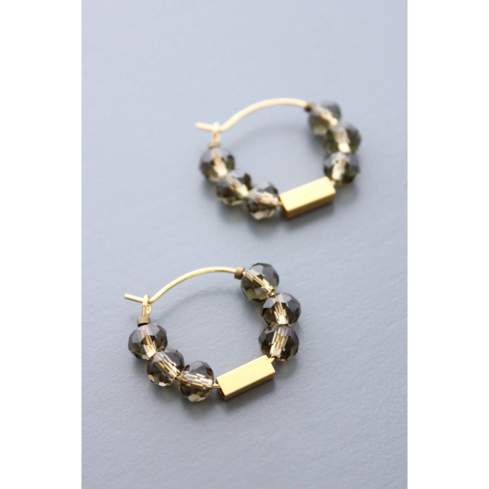 18k gold plated brass hoops with black diamond glass rondelles. Each half pair weighs .07 oz and measures .75 inches.