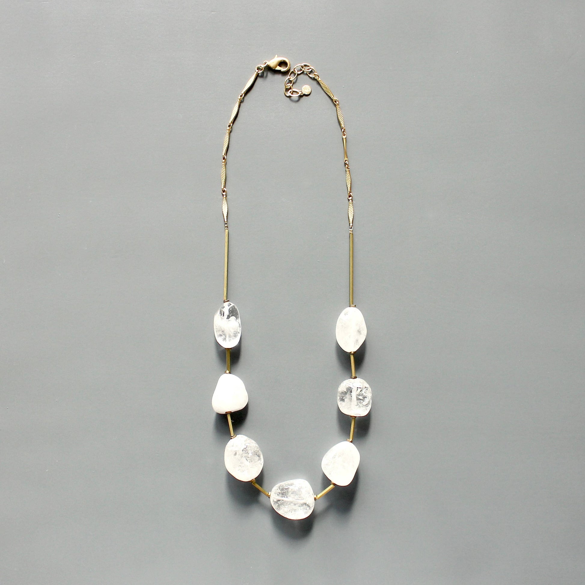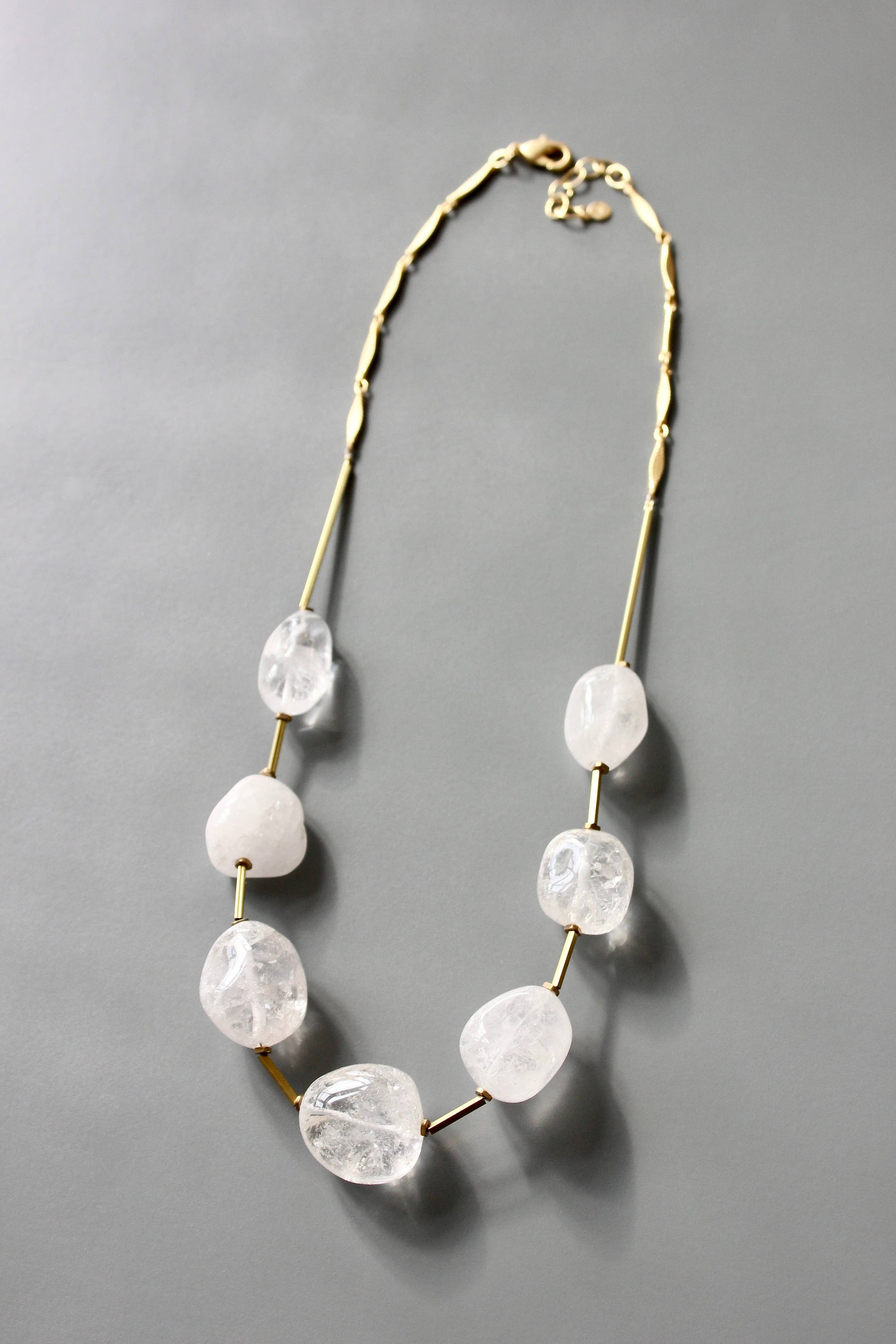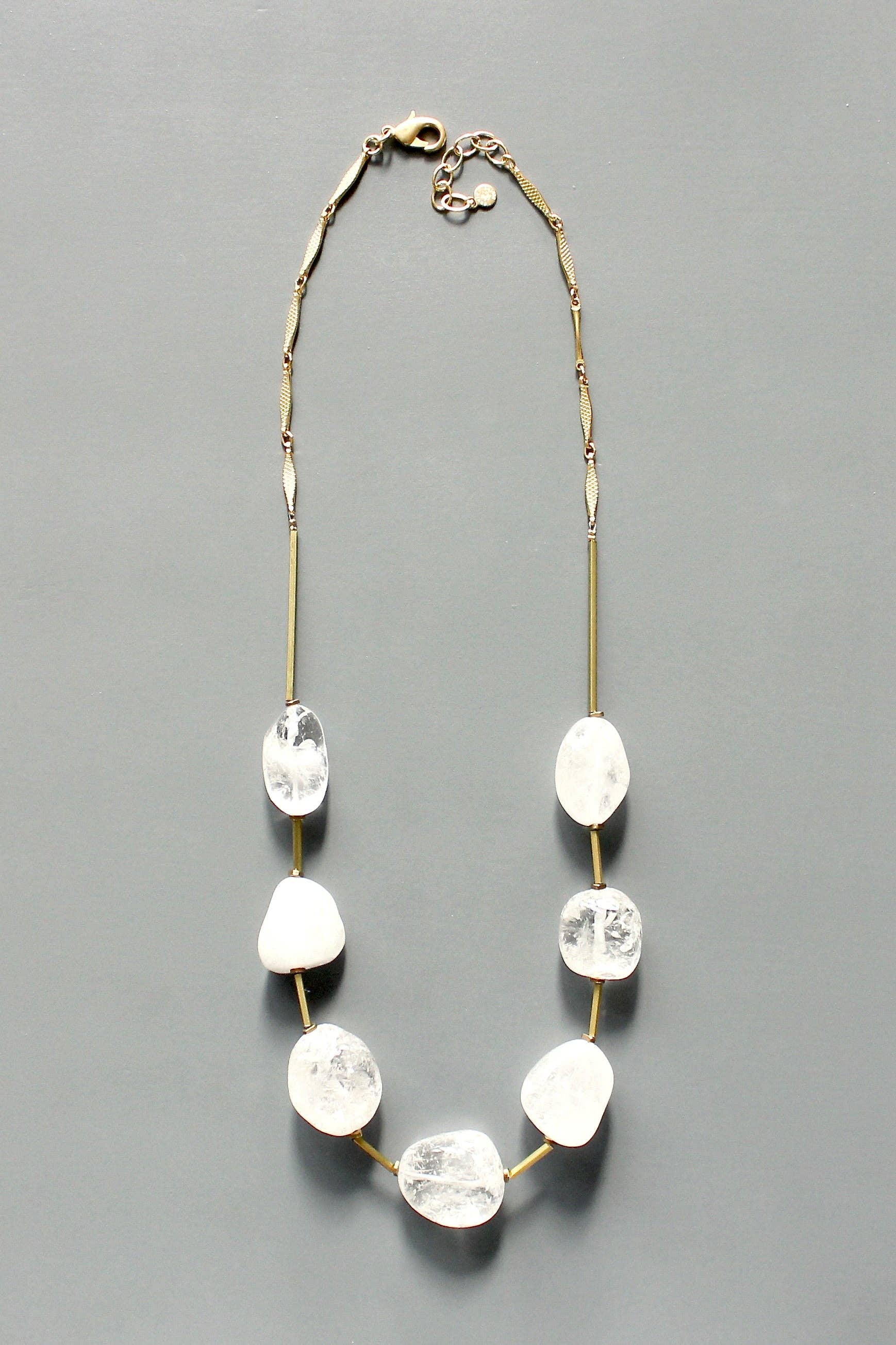 26” necklace with quartz nuggets, brass tubes, and 18k gold plated brass chain. 2 inch extender.